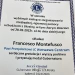 Charytatywną działalność LC Warszawa Centrum na rzecz Ukrainy podjętą już czwartego dnia wojny docenił gubernator polskiego okręgu LCI Jerzy Ciesiul adresując do klubu List Gratulacyjny. /czytaj obok/