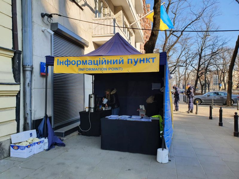Punkt informacyjny został zorganizowany po to aby odciążyć ambasadę, która w czasie wojny ma szczególnie dużo pracy, od nieustannego udzielania przebywającym w Warszawie uchodźcom informacji, takich np. jak gdzie mieści się ukraiński konsulat, albo siedziba polskiej straży granicznej, w której można uzyskać zaświadczenie o terminie