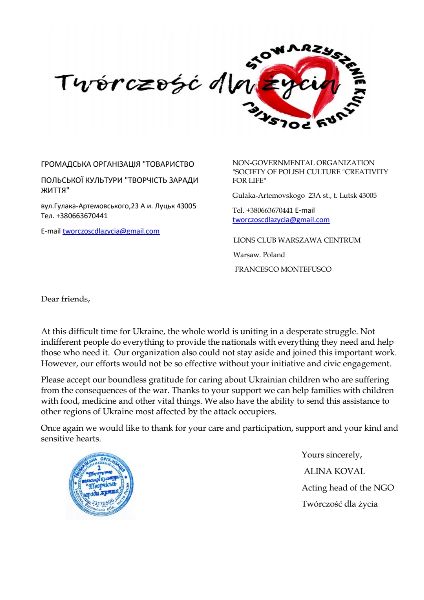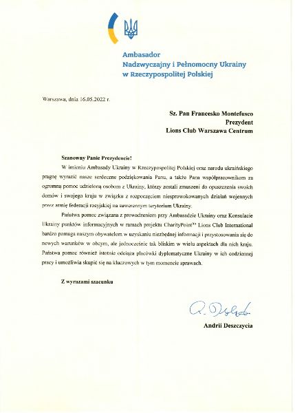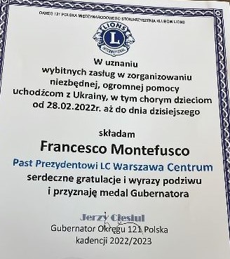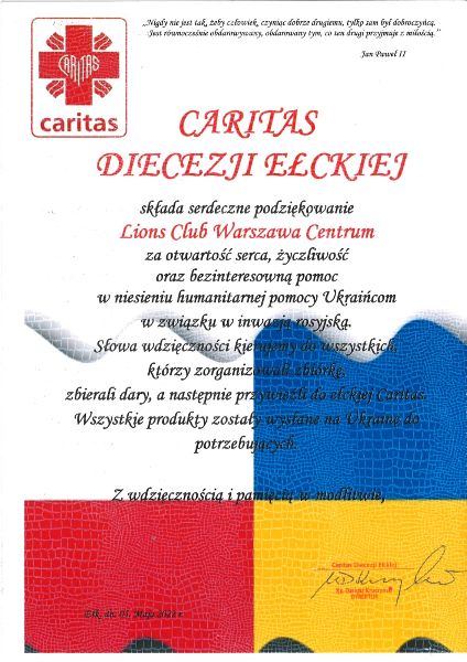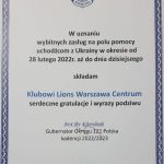 Charytatywną działalność LC Warszawa Centrum na rzecz Ukrainy podjętą już czwartego dnia wojny docenił gubernator polskiego okręgu LCI Jerzy Ciesiul adresując do klubu List Gratulacyjny. /czytaj obok/