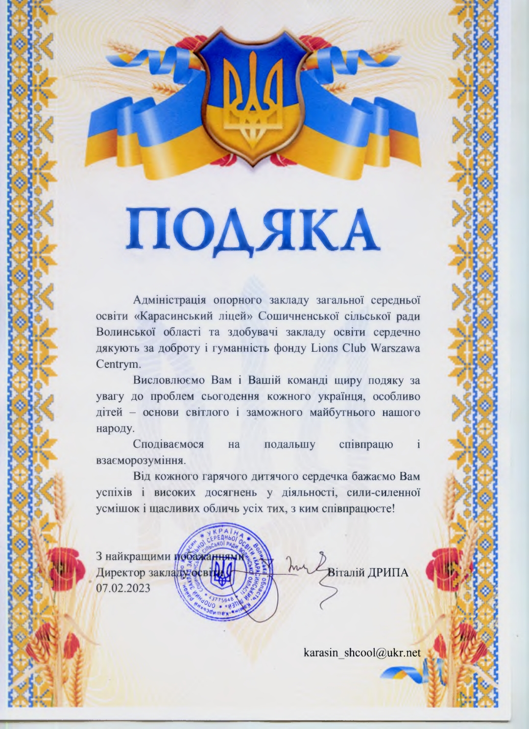 Miłe dowody wdzięczności za przekazane dary otrzymaliśmy od Rady Regionalnej w Łucku oraz od dyrekcji szkoły w Karasinie na Wołyniu.