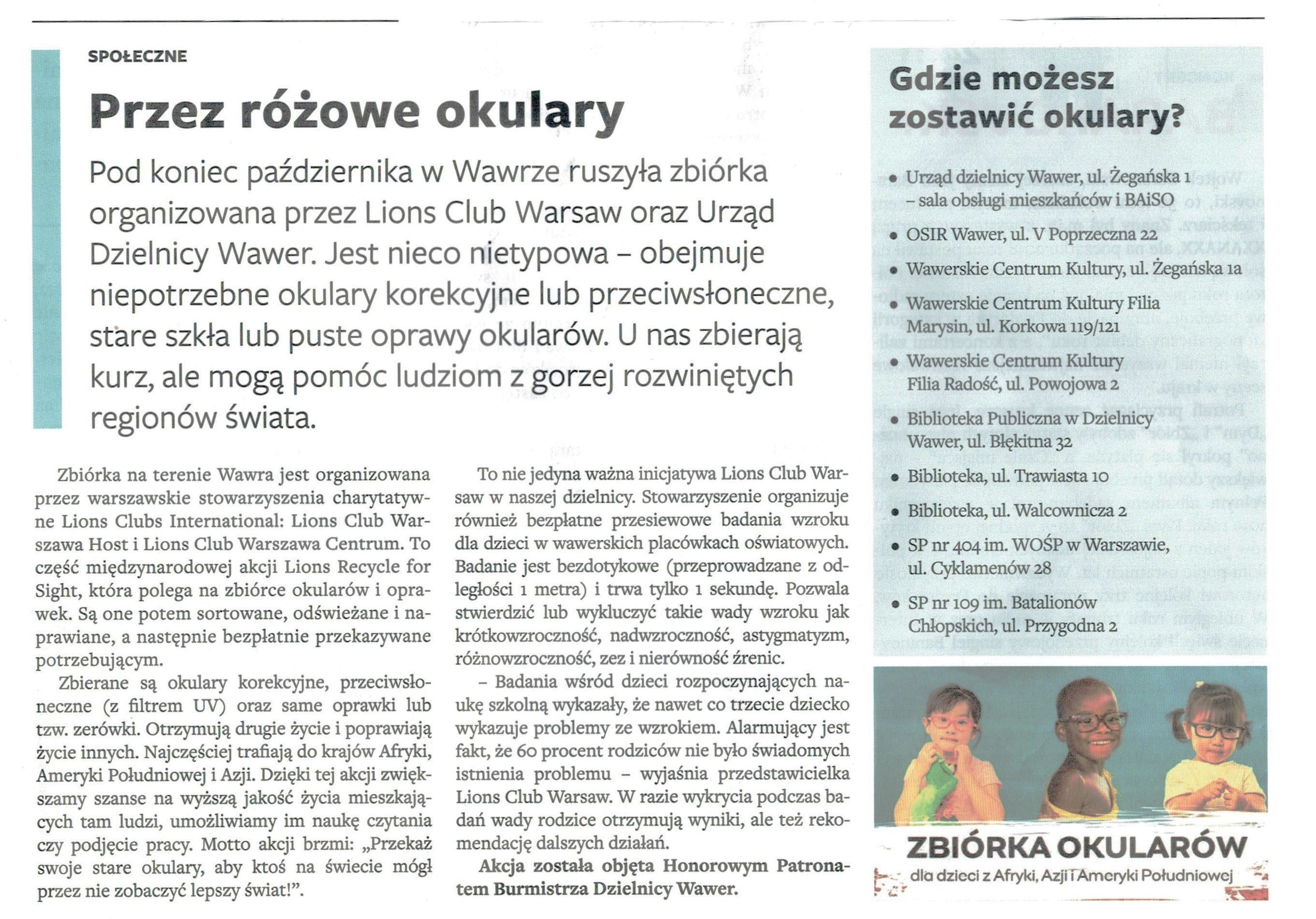 Kurier Wawerski o zbiórce okularów (październik 2024) Pod tytułem „Przez różowe okulary” Kurier Wawerski zamieścił spory artykuł o realizowanej z naszym dużym udziałem akcji zbiórki okularów dla dzieci Afryki, Azji, Ameryki Południowej. Gazeta zamieściła także adresy punktów zbiórki.